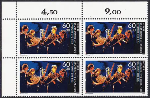 BERLIN 1988 Michel-Nummer 808 postfrisch BLOCK ECKRAND oben links - Wettbewerb Jugend musiziert: Bläserquintett