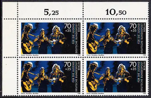 BERLIN 1988 Michel-Nummer 809 postfrisch BLOCK ECKRAND oben links - Wettbewerb Jugend musiziert: Trio mit Gitarre, Madoline und Blockflöte