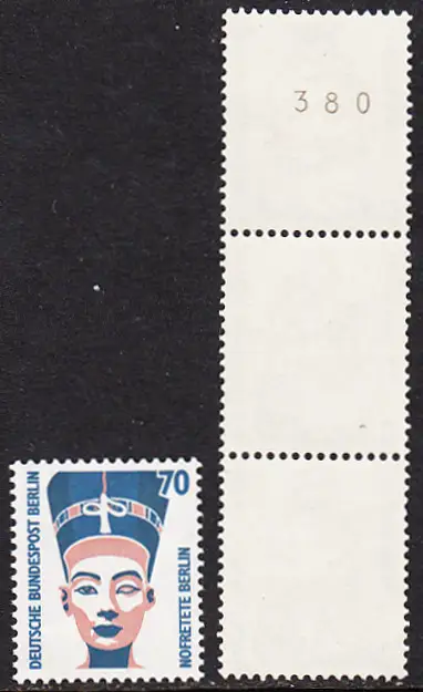 BERLIN 1988 Michel-Nummer 814 postfrisch vert.STRIP(3) m/ rücks.Rollennummer 380 - Sehenswürdigkeiten: Nofretete-Büste, Berlin