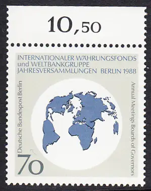 BERLIN 1988 Michel-Nummer 817 postfrisch EINZELMARKE RAND oben - Jahresversammlungen des Internationalen Währungsfonds (IWF) und der Weltbankgruppe, Berlin