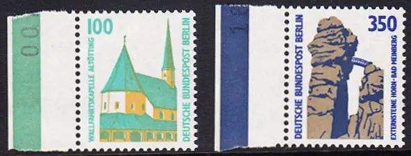 BERLIN 1989 Michel-Nummer 834-835 postfrisch SATZ(2) EINZELMARKEN RÄNDER links - Sehenswürdigkeiten: Wallfahrtskapelle, Altötting / Externsteine, Horn-Bad Meinberg