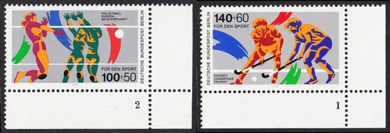 BERLIN 1989 Michel-Nummer 836-837 postfrisch SATZ(2) EINZELMARKEN ECKRÄNDER unten rechts (FN) - Sporthilfe: Volleyball-Europameisterschaften der Damen, Hamburg, Karlsruhe und Stuttgart / Hockey Champions Trophy, Berlin