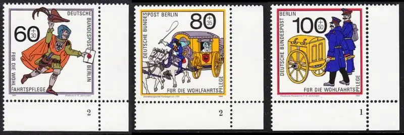 BERLIN 1989 Michel-Nummer 852-854 postfrisch SATZ(3) EINZELMARKEN ECKRÄNDER unten rechts (FN) - Postbeförderung im Laufe der Jahrhunderte