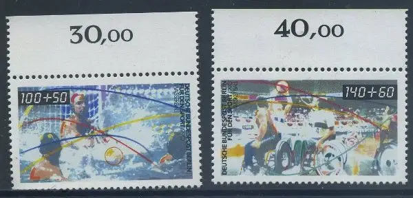 BERLIN 1990 Michel-Nummer 864-865 postfrisch SATZ(2) EINZELMARKEN RÄNDER oben (c) - Beliebte Sportarten: Wasserball / Rollstuhl-Basketball