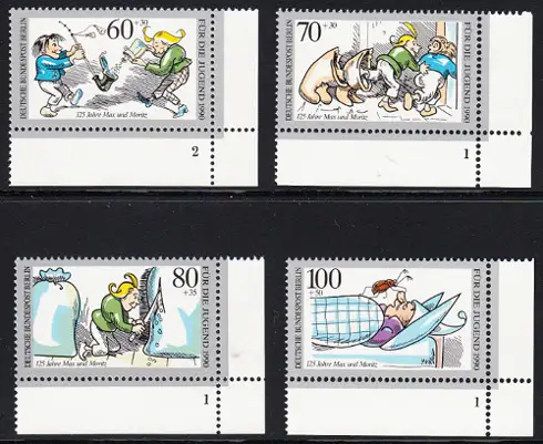 BERLIN 1990 Michel-Nummer 868-871 postfrisch SATZ(4) EINZELMARKEN ECKRÄNDER unten rechts (FN) - 125 Jahre Max und Moritz