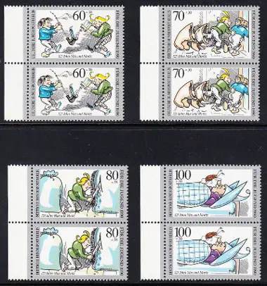 BERLIN 1990 Michel-Nummer 868-871 postfrisch SATZ(4) vert.PAARE RÄNDER links - 125 Jahre Max und Moritz