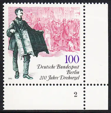 BERLIN 1990 Michel-Nummer 872 postfrisch EINZELMARKE ECKRAND unten rechts (FN) - 200 Jahre Drehorgel
