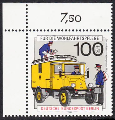 BERLIN 1990 Michel-Nummer 878 postfrisch EINZELMARKE ECKRAND oben links - Geschichte der Post und Telekommunikation: Elektro-Paketzustellwagen