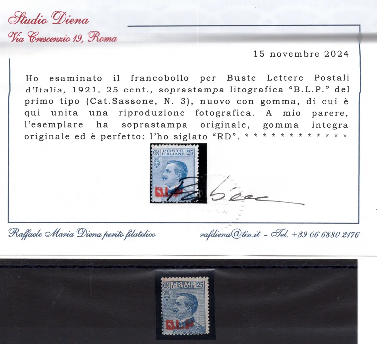 MNH - Vollgummi - - B.L.P. Cent. 25 Aufdrucke des I. Typ Nr. 3 von ausgezeichneter Qualität mit Vollgummi, mittelmäßiger Zentrierung - Zertifikat Studio Diena Cod. 2623/WEB