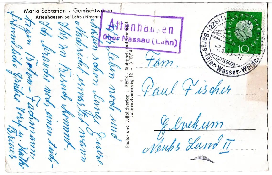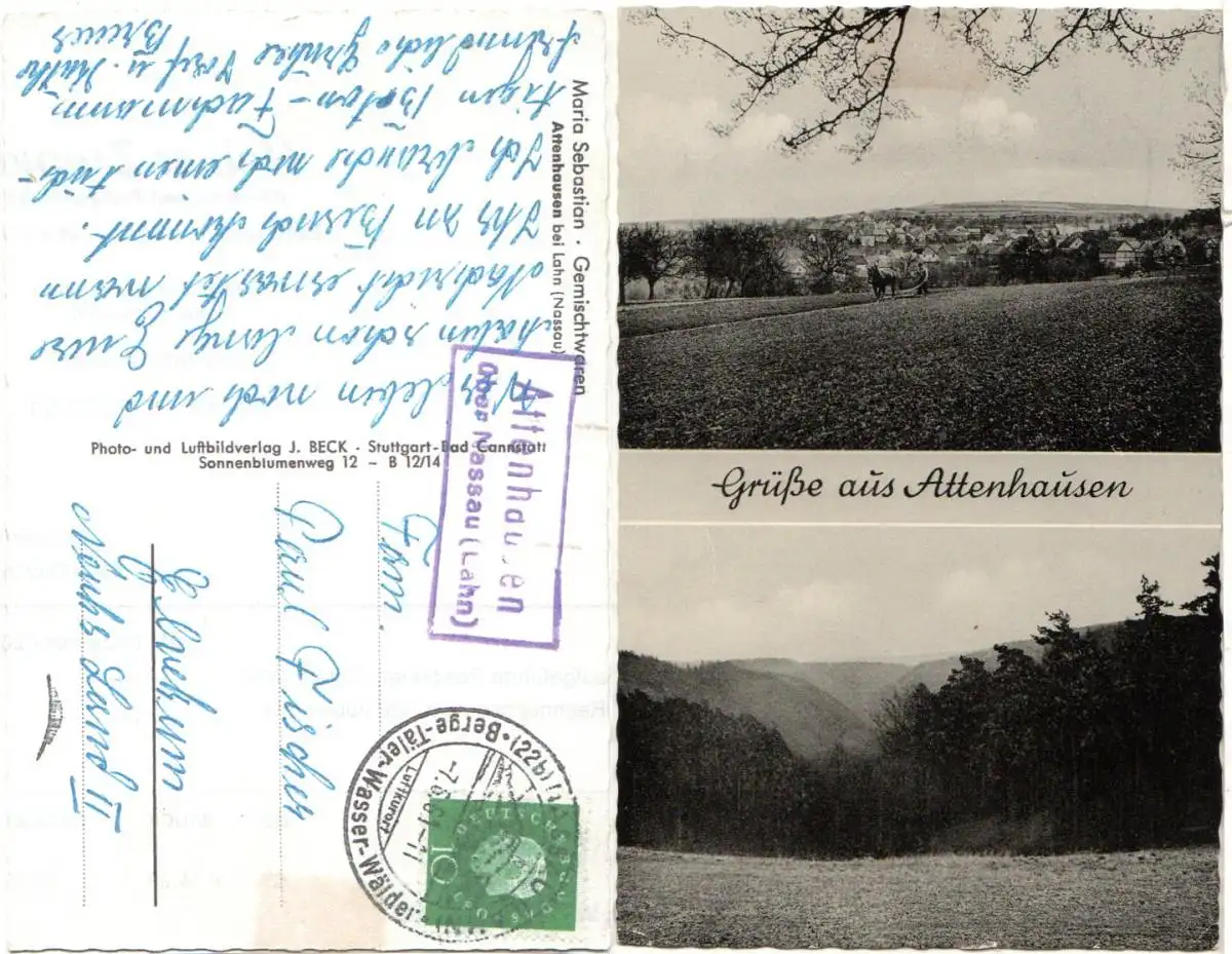 BRD 1961, Landpost Stpl. ATTENHAUSEN über Nassau (Lahn)auf sw-AK m. 10 Pf.