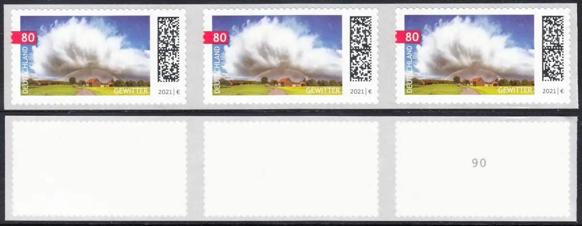 BUND 2021 Michel-Nummer 3617 postfrisch horiz.STRIP(3) m/ rücks. Nummer -90- (Rollenmarken / selbstklebend)
