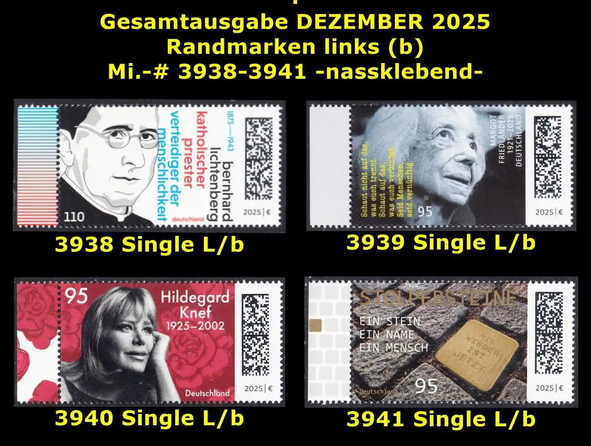 BUND 2025 Michel-# 3938-3941 postfrisch Gesamtausgabe DEZEMBER 2025: 4 EINZELMARKEN RÄNDER links (b)