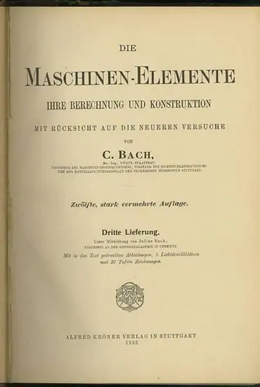 Bach, C: Die Maschinen-Elemente ihre Berechnung und Konstruktion. Mit Rücksicht auf die neueren Versuche. Dritte Lieferung. Unter Mitwirkung von Julius Bach.