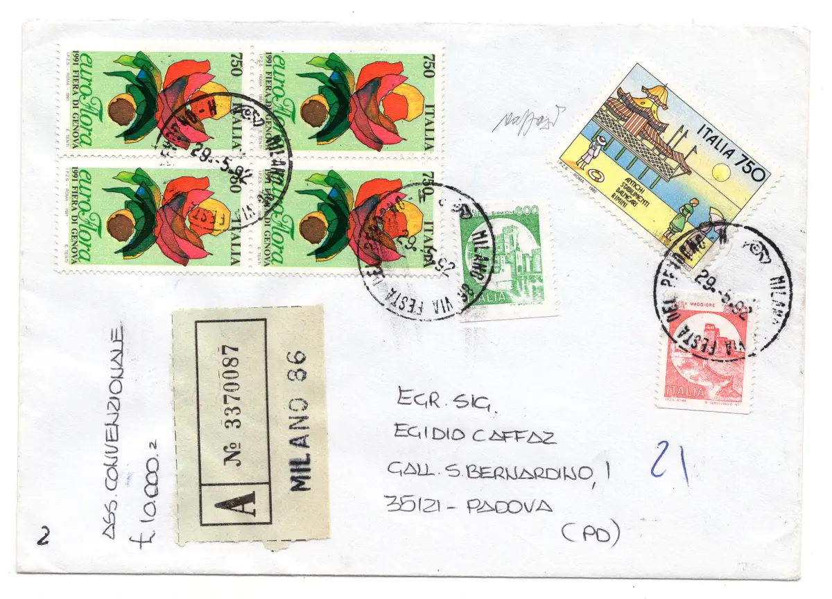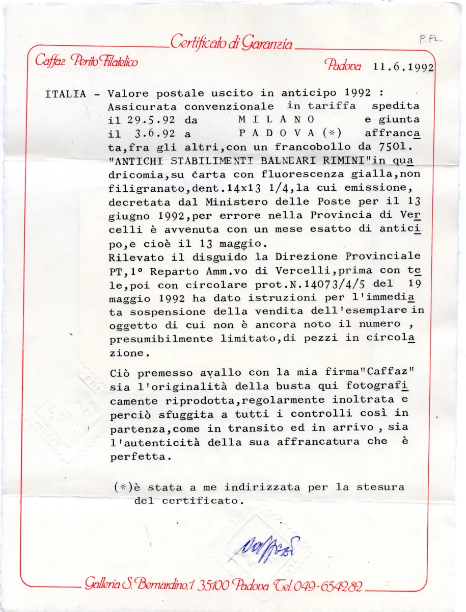 Umschlag - Badeanstalten Rimini Nr. 2017, der vor der Ausgabe verwendet wurde - auf versichertem Umschlag von Mailand nach Padua am 29.5.92 mit zusätzlicher Frankatur - Ungewöhnlich - Cert. Caffaz Cod. 387/17