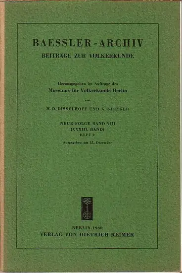 Baessler - Archiv. - Disselhoff, H. D. + K. Krieger (Herausgeber): Baessler-Archiv. Beiträge zur Völkerkunde. Neue Folge, Band 8 (33. Band), Heft 2. Im Inhalt Beiträge u.a. von: Peter Fuchs, Dieter Eisleb, Hans Feriz, Axel von Gagern, Horst Nachtigall, He