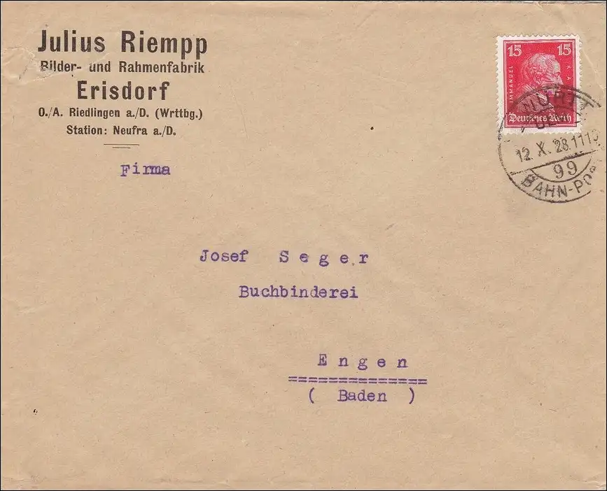 Poste ferroviaire: Lettre d'Erisdorf/Riedlingen à Engen avec poste ferroviaire cachet 1928