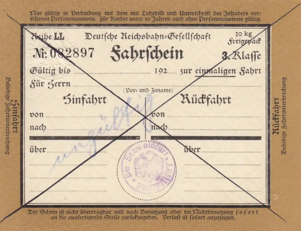 Poste ferroviaire: billet de 3ème classe, porc, retour en retour