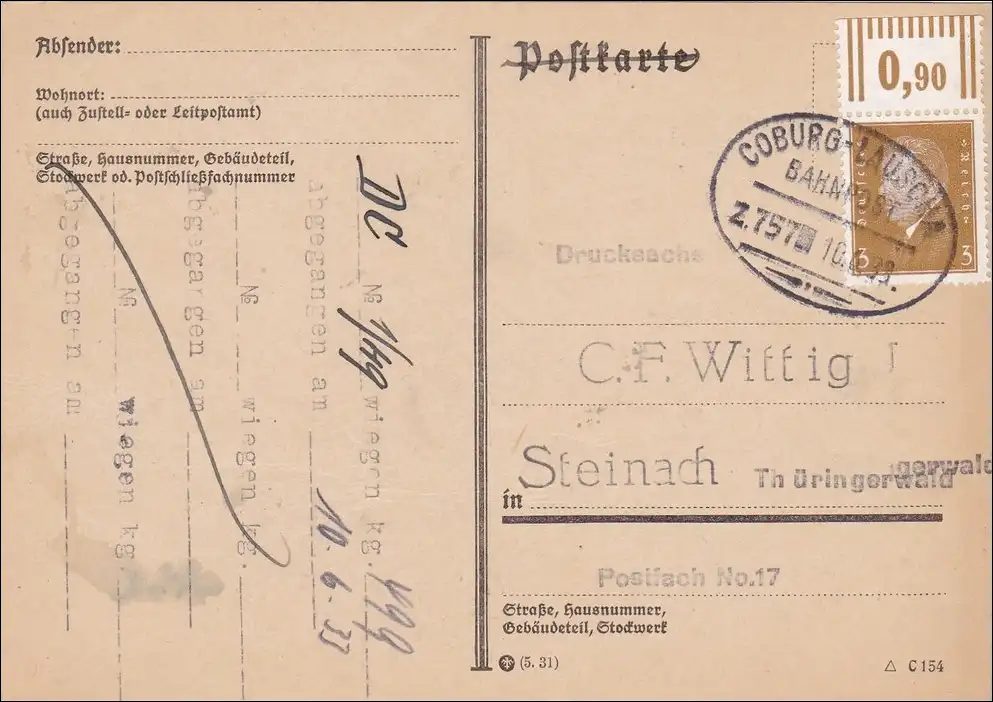 Poste ferroviaire: Carte postale avec cachet de train Coburg-Lauscha 1933, vers Steinach/Thüringen