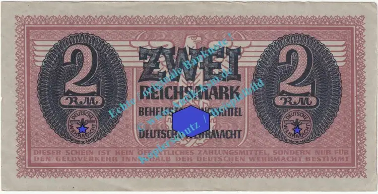 Gutschein / Banknote über Zwei Reichsmark von 1942-1944 , deutsche Wehrmacht / Drittes ReichGrabowski / Rosenberg / Pick : DWM-7 / 506 / M.37