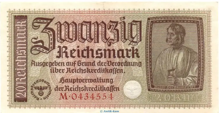 Banknote über 20 Reichsmark ohne Datum , drittes Reich - zweiter Weltkrieg - ReichskreditkassenGrabowski / Rosenberg / Pick : ZWK-5.a / 554 / 139