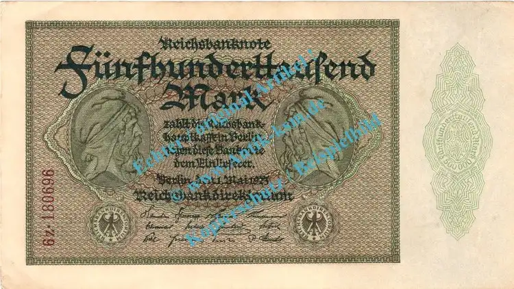 Gutschein / Banknote über Fünfhunderttausend Reichsmark von 1923 , Weimarer Republik - InflationGrabowski / Rosenberg / Pick : DEU-99.f / 87 / P.88