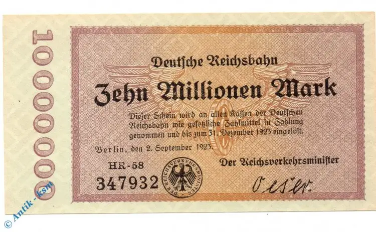 Banknote über Zehn Million Mark von 1923 , Inflation , Deutsche ReichsbahnGrabowski / Pick  : RVM-4 / S.1014