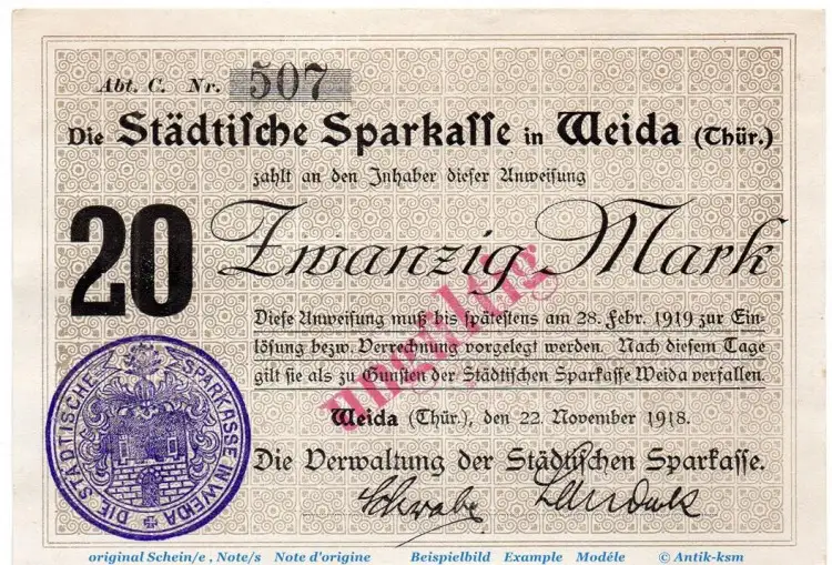 Banknote Sparkasse Weida , 20 Mark Schein in kfr.E , Geiger 541.02 , von 1918 , Thüringen Großnotgeld