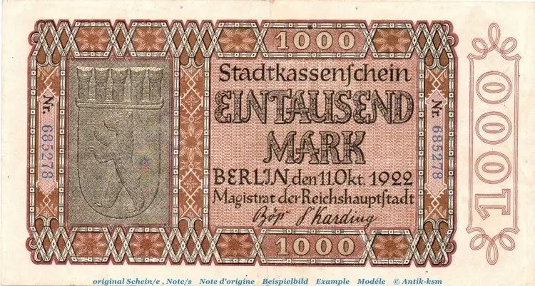 Notgeld über Eintausend Mark , Stadt Berlin , GrossnotgeldBundesland : Brandenburg  ,  Müller : 310.3