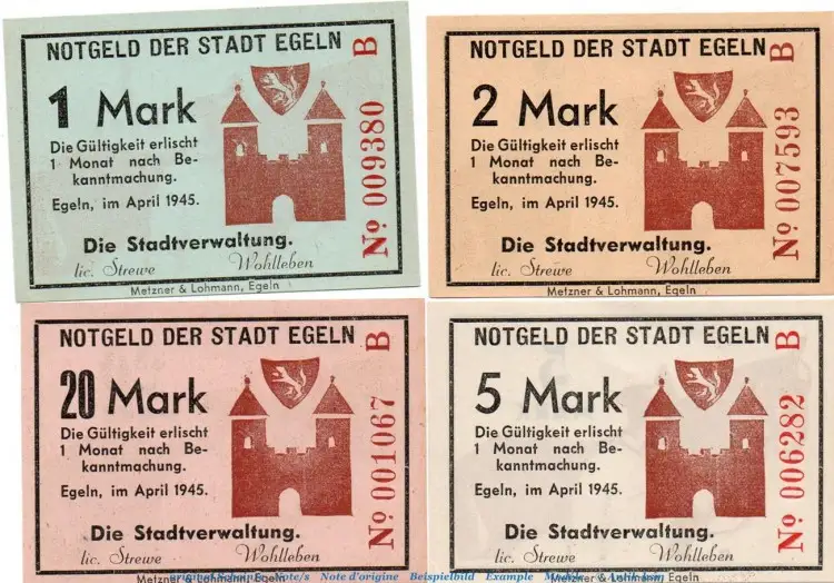 Banknote Stadt Egeln , Set mit 4 Scheinen in kfr. Serie B , April 1945 , Sachsen Anhalt , Notgeld 1945