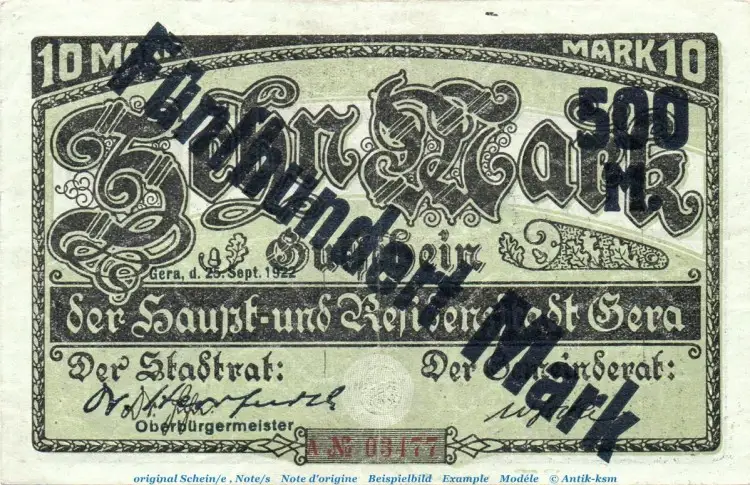 Notgeld Überdruck über Fünfhundert Mark , Stadt Gera , GrossnotgeldBundesland : Thüringen  ,  Müller : 1655.2