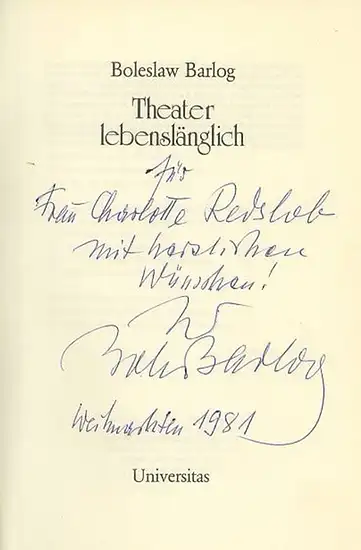 Titel: Theater lebenslänglich. Mit handschriftlicher Widmung und Autograph des Autors "für Frau Charlotte Redslob mit herzlichen Wünschen! Ihr Bole (?) Barlog Weihnachten 1981" auf dem Titel!