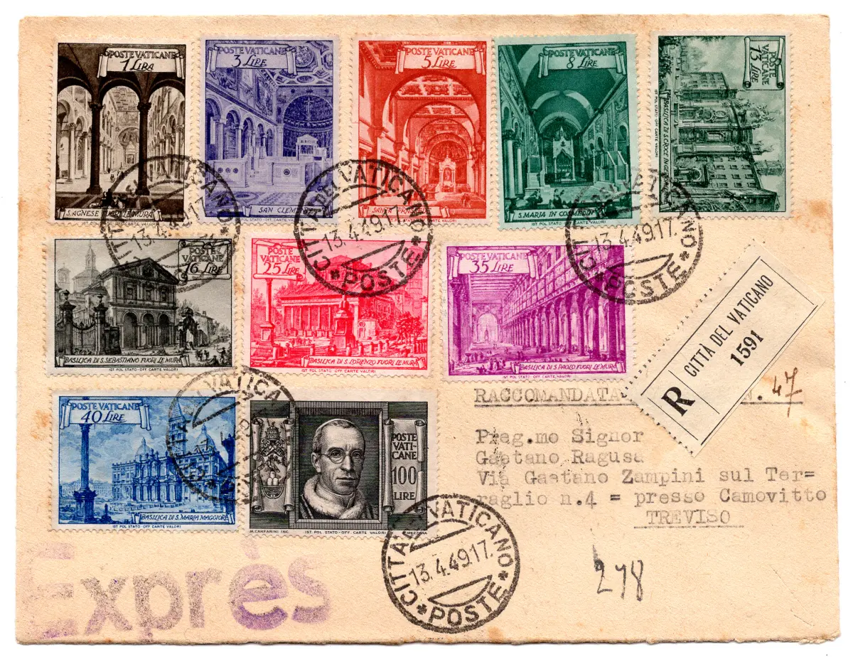 - Basilika Nr. 122/131 + Exp. 11/12 komplette Serie auf Umschlag Racc. exp. für Treviso am 13.4.49 - einige Marken sind auf der Rückseite angebracht - Ungewöhnlich - Kat. euro 350 n. 805/L