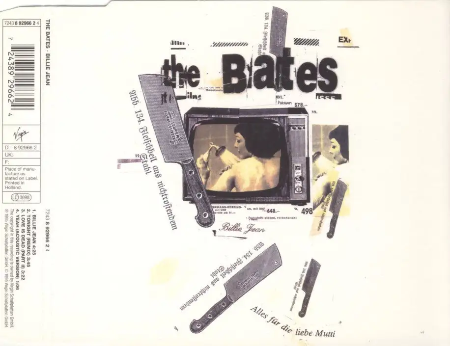 CD Single Bates - Billie Jean, Michael Jackson coverversion, état CD VG+ housse M-; Fabriqué en Netherlands 1995 Virgin 8 92966 2, Tracks Billie Jean 4:25, Tonight [RMX] 3:45, Love Is Dead [Part II] 322, Yeah [Acoustic Vers.] 1:06