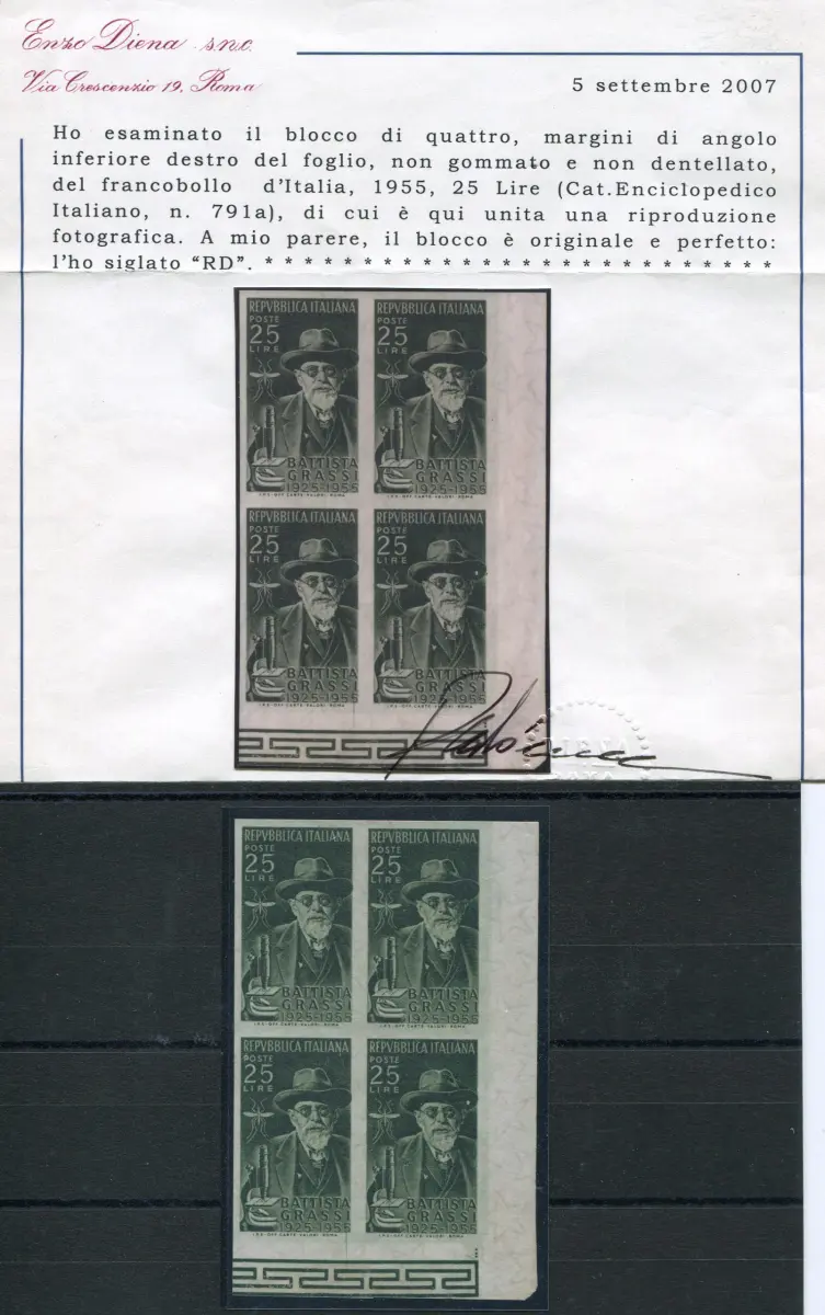 Battista Fette ungezahnte Sorte Ohne Gummi - Battista Grassi Nr. 789 Quartina a. von f. ungezähnt, filigrane Sterne I. Typ waagerecht (Kat. Griffe Nr. 9 der pegolesischen Briefmarken) - Schön und ungewöhnlich in mehreren Cod. 654/14