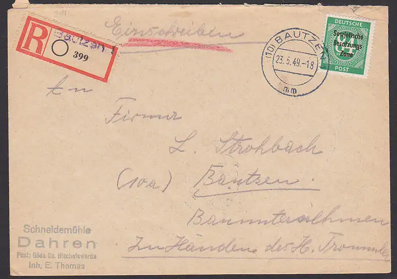 Bautzen Aushilfs-R-Zettel 23.5.49 84 Pfg. Ziffern mit SBZ-Aufdruck, berfr. Ortsbrief, Abs. G”da b. Bischofswerda