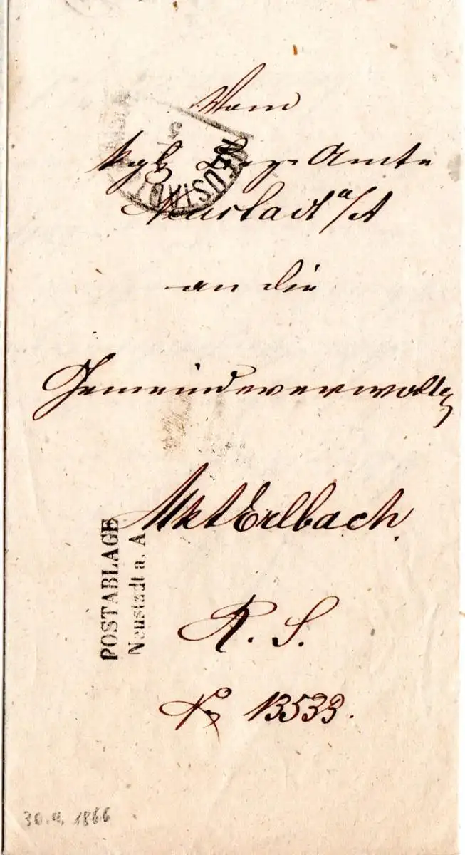 Bayern 1866, Postablage u. HKS Neustadt a.A. auf Brief n. Markt Erlbach