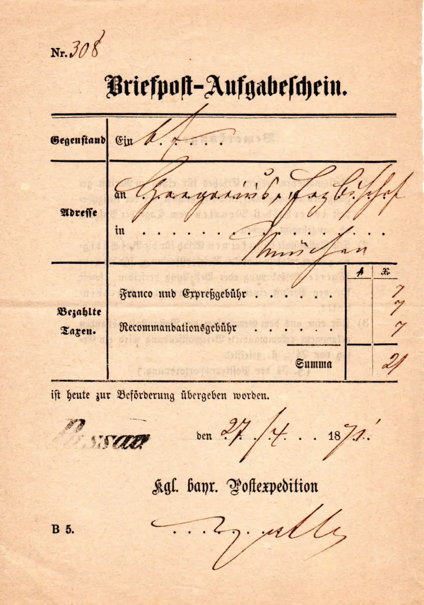 Bayern 1871, L1 Passau auf Express Postschein f. einen eingeschriebenen AR Brief