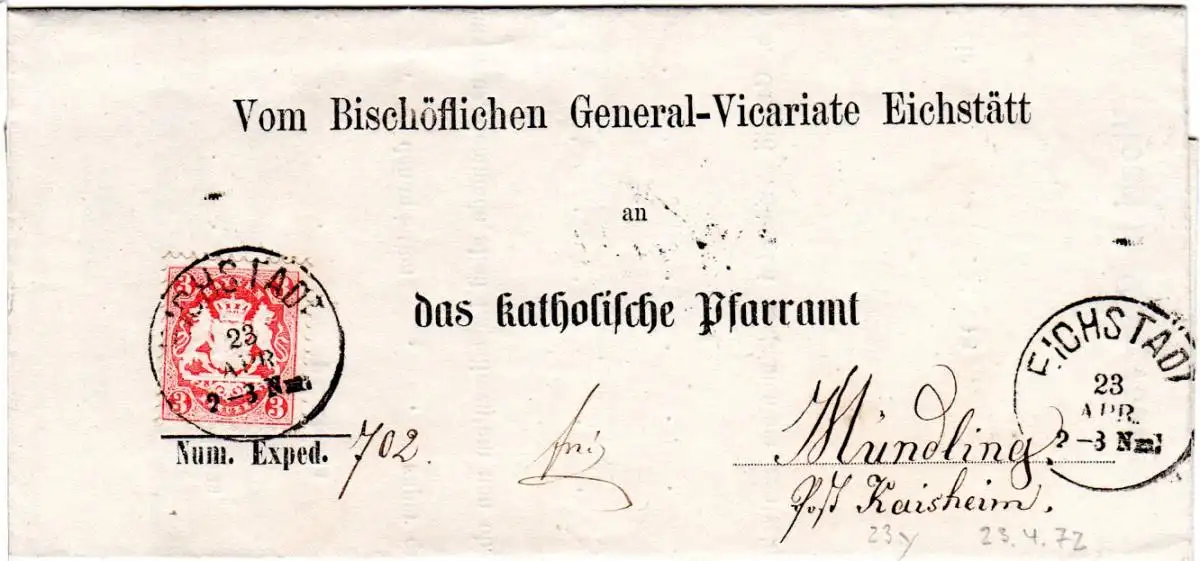 Bayern 1872, K1 Eichstädt auf Vordruckbrief n. Mündling via Donauwörth