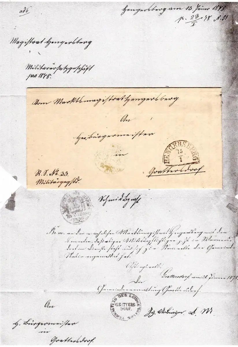 Faltbrief m. kpl. Inhalt inkl. Gemeinde-Siegelstempel v. Hengersber u. Grattersdorf sowie Unterschrift des Bürgermeisters v. Grattersdorf.