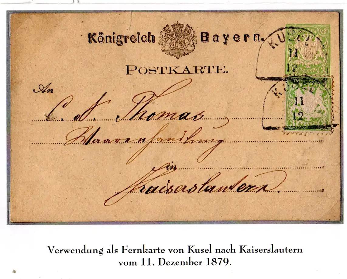 Bayern 1879, 3 Pf. WZ weite Welle auf 3 Pf. Ganzsache v. Kusel n. Kaiserslautern