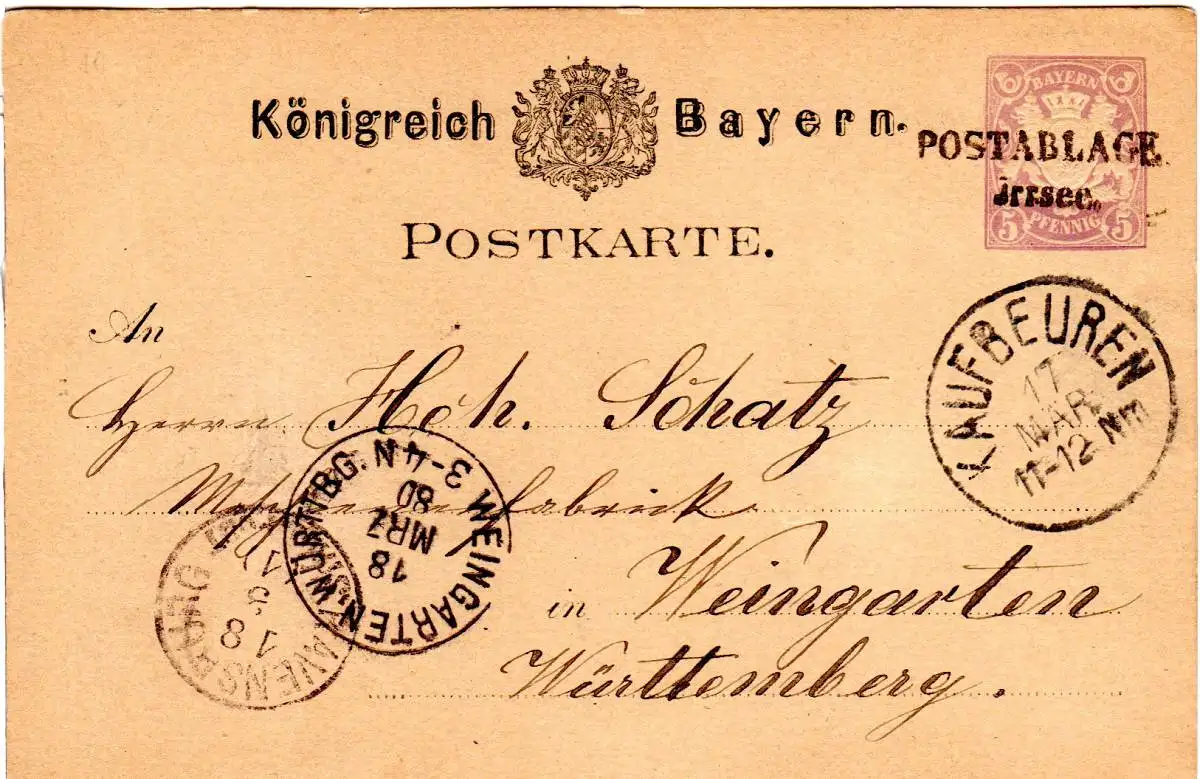 Ganzsache über Kaufbeuren mit 2 weiteren Württemberg Stempeln. Rückseitig 2 Albumklebestellen.