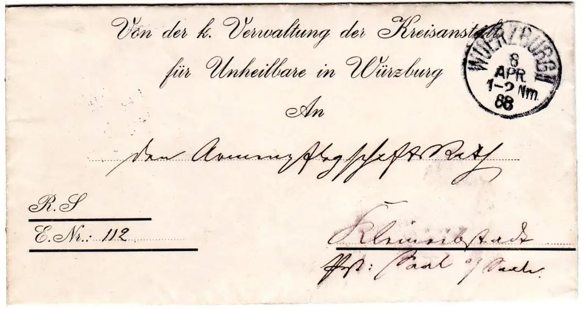 Bayern 1888, K1 Wuerzburg II auf RS Brief d. KA f. Unheilbare n. Kleineibstadt