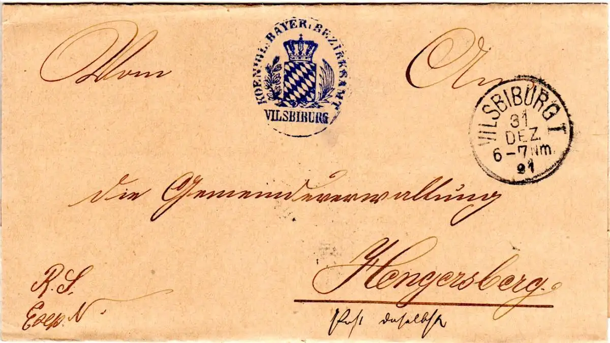 Bayern 1891, K1 u. blauer Siegelstpl. v. Vilsbiburg auf Brief n. Hengersberg.