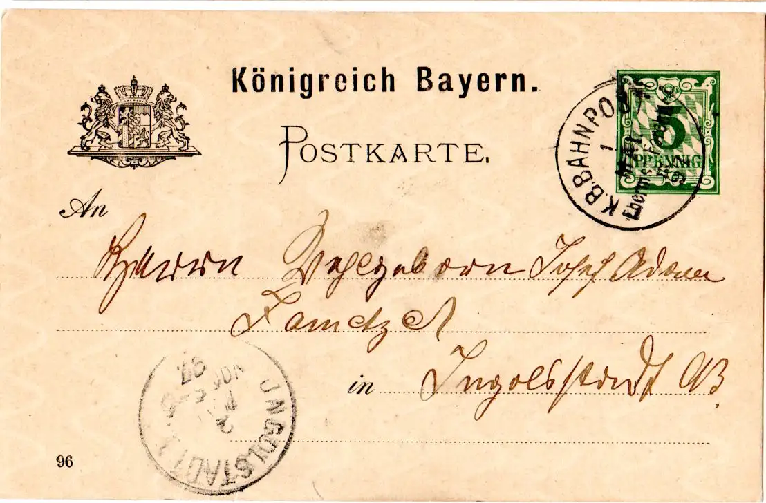 K1 K.B. BAHNPOST Ebermst.-Forchh. III klar auf Ganzsache m. Absenderangabe Gosberg nach Ingolstadt.