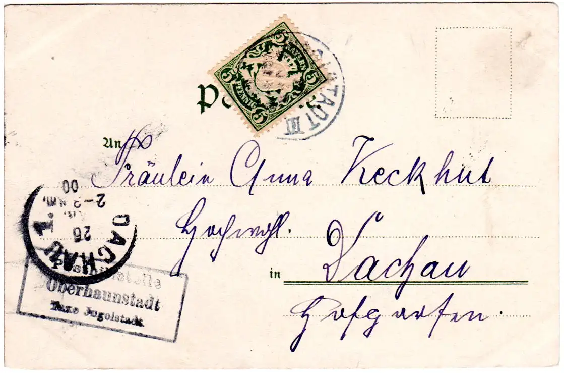Bayern 1900, Posthilfstelle OBERHAUNSTADT Taxe Ingolstadt auf Karte m. 5 Pf.