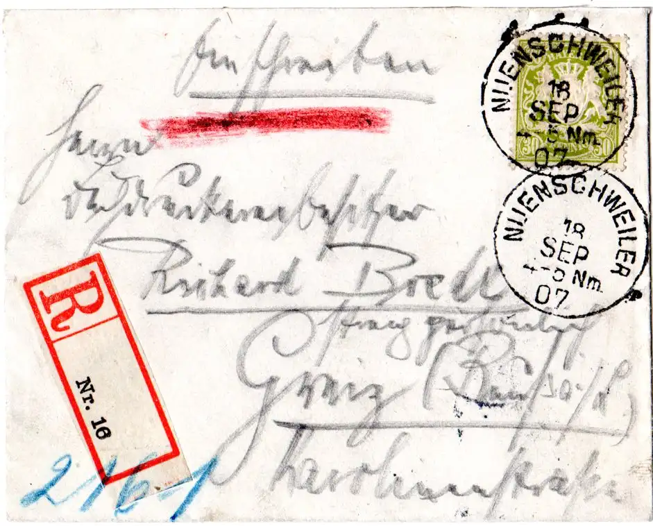 Bayern 1907, 30 Pf. auf Einschreiben Brief m. Pfalz-K1 NUENSCHWEILER