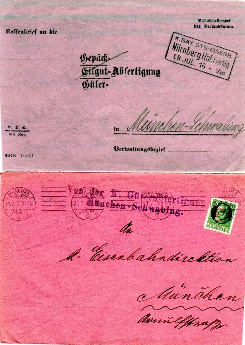 Bayern 1916, doppelt verw. Umschlag d. K.Bay. Sts. Eisenbahn Nürnberg/Schwabing