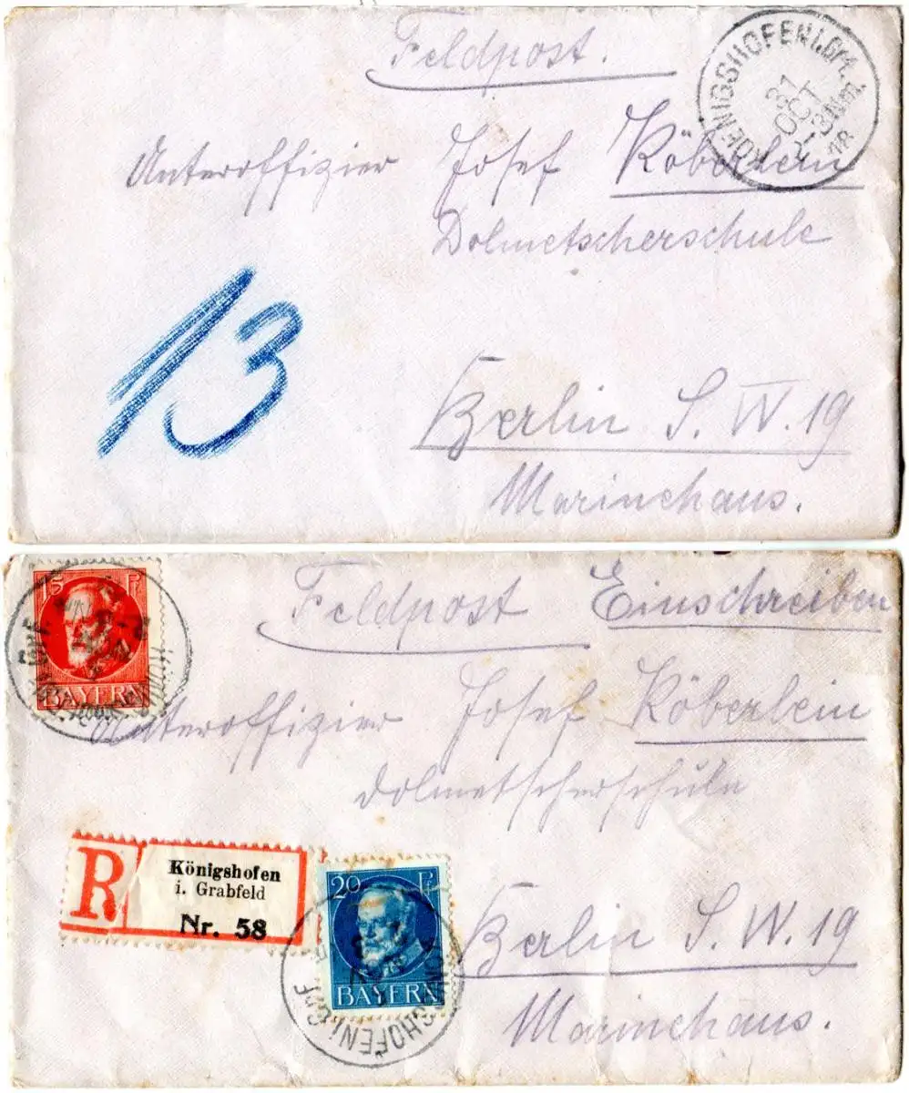 Bayern 1918, 2 Feldpost Briefe v. Königshofen i. Grf., 1mal per Einschreiben