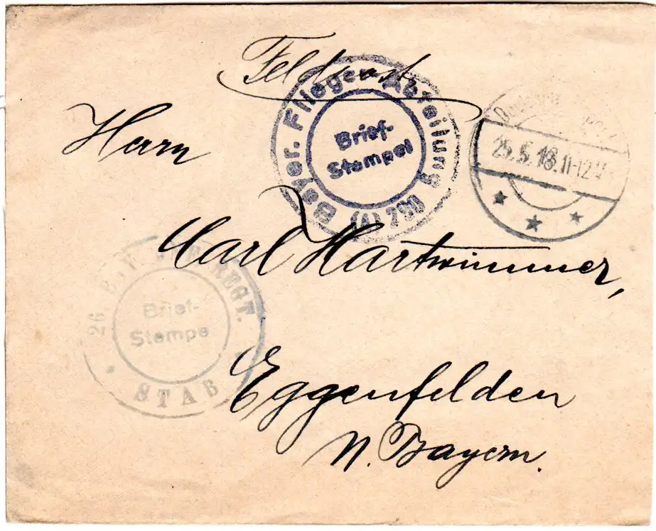 Feldpostbrief n. Eggenfelden m. Briefstempel Bayer. Flieger-Abteilung (A)290 sowie 26. Bay. Inf.Regt. STAB.
