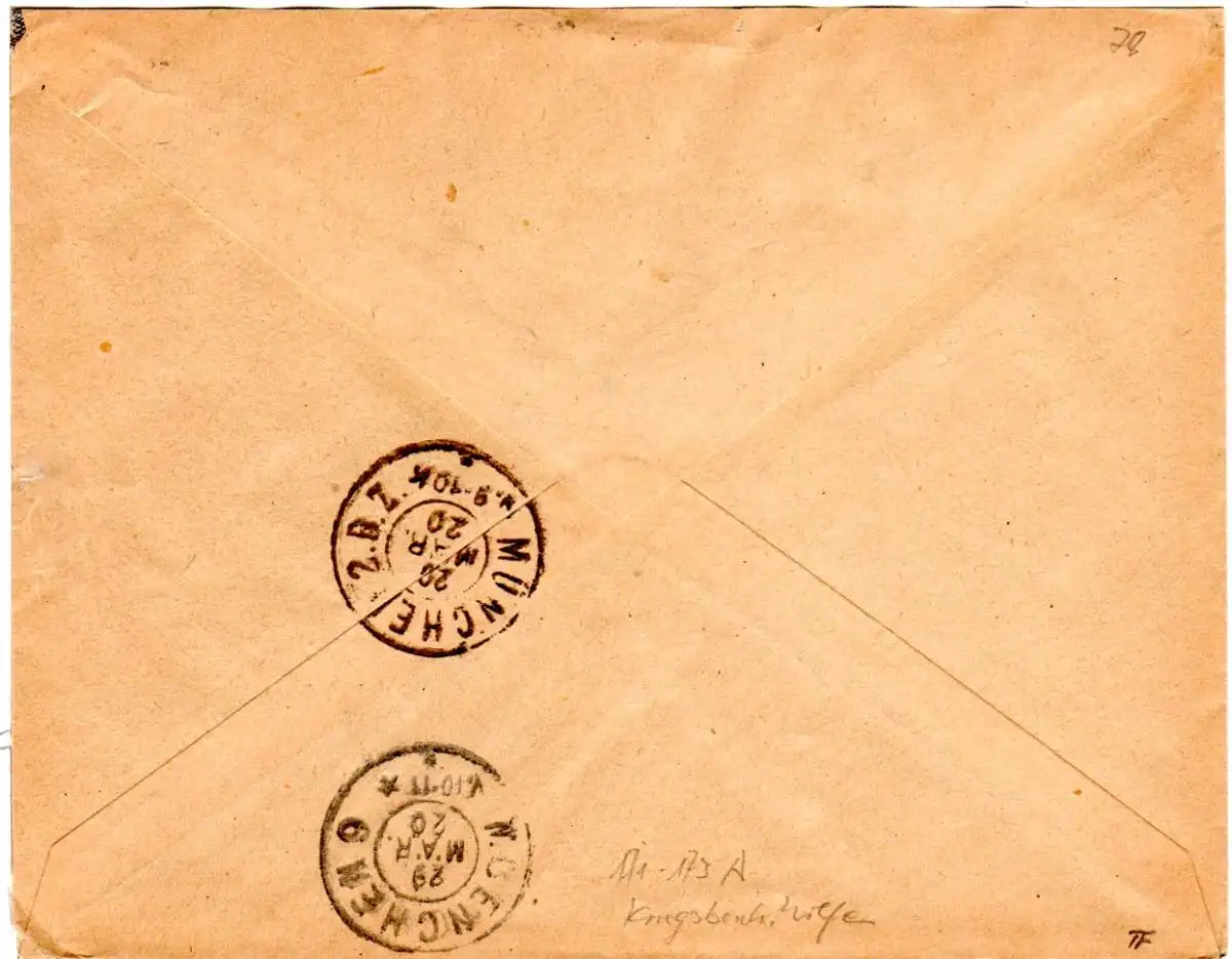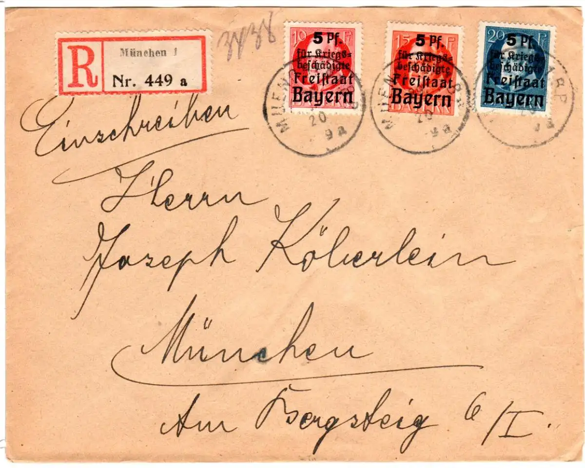 Bayern 1920, 3 Werte Kriegsgeschädigtenhilfe kpl. auf Reko Orts Brief München